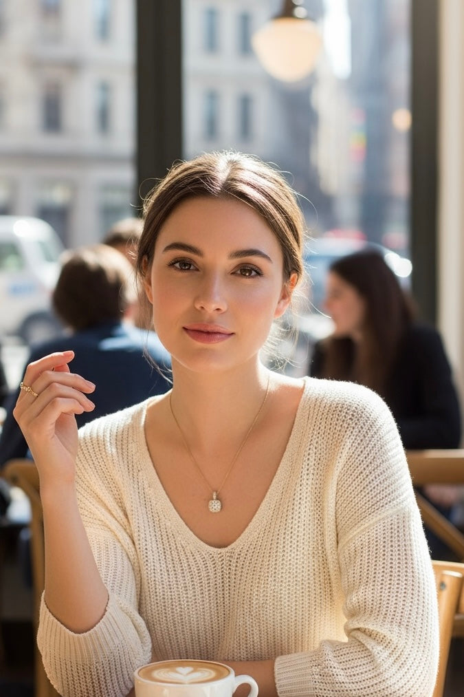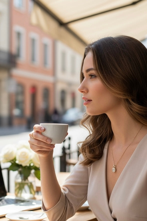 Hestia (Pronounced: eh s thee aa, Greek goddess of Fire) Small round motif short necklace with hand set high quality CZ, White Gold finish